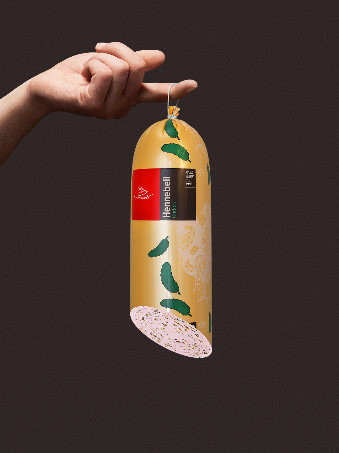 Hühnerfleisch (58%), Trinkwasser, Gurkenwürfel (10%), Sonnenblumenöl, Maltodextrin, Speisesalz, Gewürze, Gewürzextrakte, Konservierungsstoff E250, Antioxidationsmittel E300, Stabilisatoren E450, E451, E452, Farbstoff E120, Dextrose.