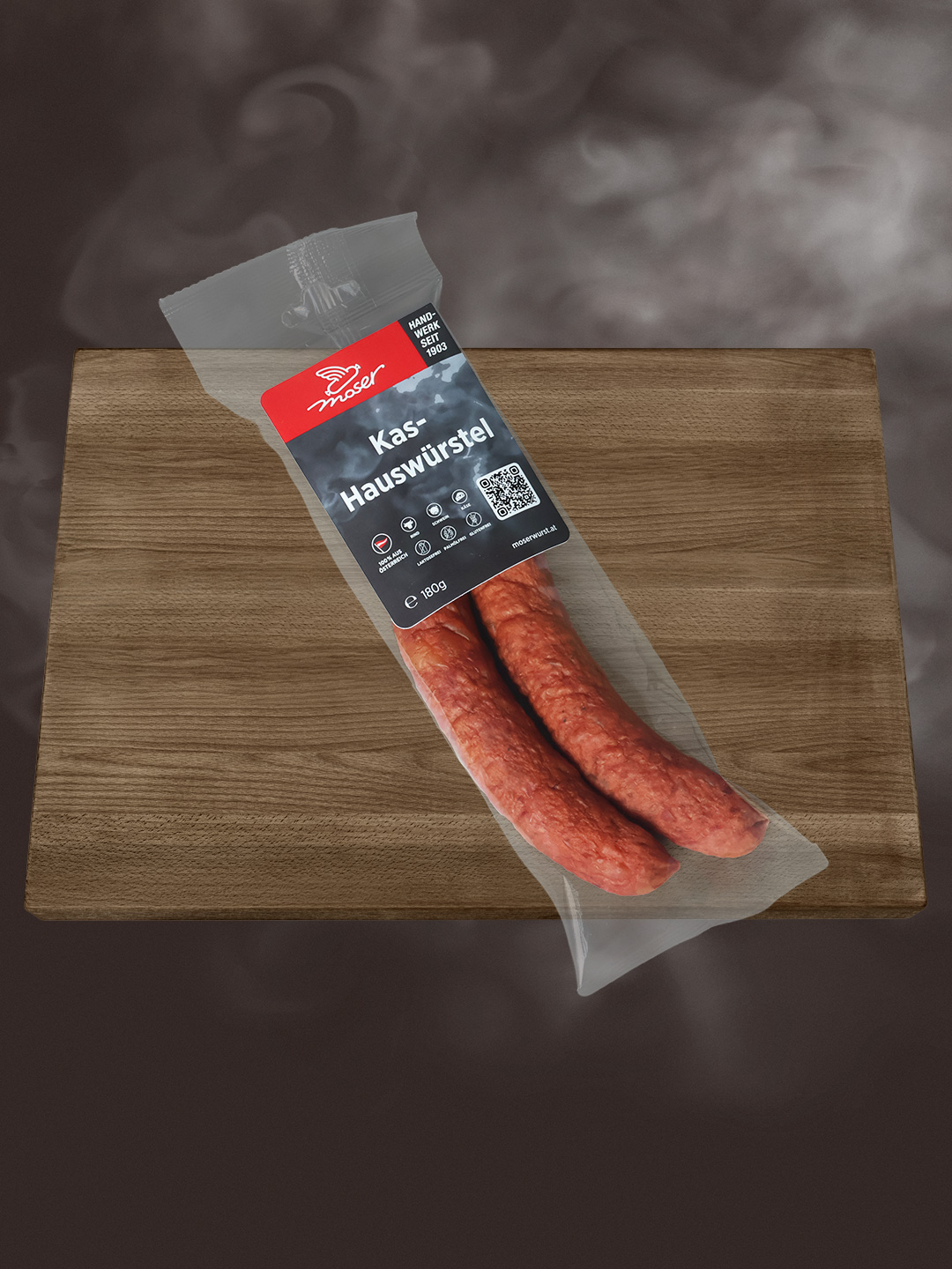 Zur Herstellung von 100g Kas-Hauswürstel wurden 115g Rind- & Schweinefleisch und 20g Emmentaler verwendet. Rind- & Schweinefleisch, Emmentaler 45% F.i.T. (enthält Milch), Speck, Trinkwasser, Nitritpökelsalz (Speisesalz, Konservierungsstoff E250), Gewürze (enthält Senf), Gewürzextrakte, Dextrose, Geschmacksverstärker E621, Antioxidationsmittel E300, E301, Stabilisatoren E450, E451, E452, Frucht- & Gemüsekonzentrat (aus Rettich, Rote Beete, Schwarze Johannisbeere, Apfel, Tomaten), Maltodextrin, Aroma, Schweinesaitling, Rauch.